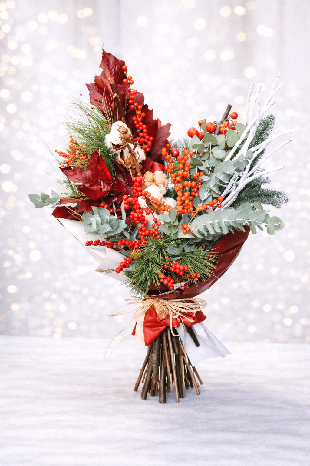Χριστουγεννιάτικο μπουκέτο με φυσικά κλαδιά πεύκου, Ίλεξ, ευκάλυπτο και βαμβάκι, δεμένο στο χέρι σε ζεστούς γιορτινούς τόνους. Μια κομψή και φυσική επιλογή για εορταστική διακόσμηση ή ξεχωριστό δώρο.