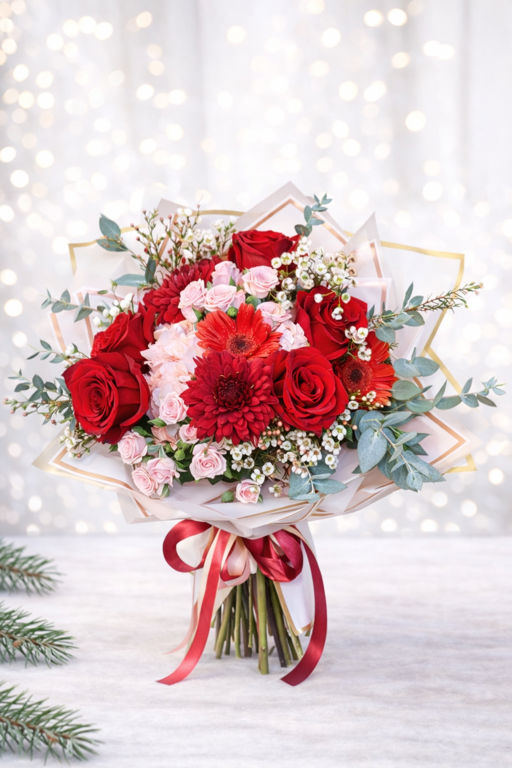 Κομψό μπουκέτο με κόκκινα τριαντάφυλλα, ζέρμπερες,τριαντάφυλλα πολυανθή και ορτανσία ροζ , δεμένο με προσεγμένο περιτύλιγμα και κορδέλα. Ιδανική επιλογή για δώρο αγάπης, γενέθλια ή ξεχωριστές στιγμές.
